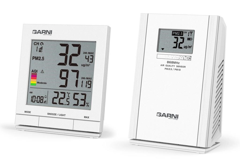Měřič kvality vzduchu GARNI 204 OneCare je určen pro vnitřní použití. Měří a zobrazuje na svém LCD displeji hodnoty kvality vzduchu – koncentraci pevných částic PM2.5 a PM10 naměřenou bezdrátovým čidlem GARNI 104Q (jedno bezdrátové čidlo je součástí balení) a také teplotu a relativní vlhkost. Pro měření pevných částic (PM) je použito švýcarské čidlo SENSIRION řady SPS ? měření pevných částic (PM) PM2.5 a PM10 bezdrátovým čidlem GARNI 104Q ? hlavní jednotka měří teplotu a relativní vlhkost a zobrazuje hodnoty pevných částic PM2.5, nebo PM10 naměřené bezdrátovým čidlem GARNI 104Q ? pro měření pevných částic jsou použita přesná švýcarská čidla SENSIRION řady SPS ? jednotkou PM jsou µg/m3 ? přehledný LCD displej hlavní jednotky o rozměrech 69 x 64 mm ? velikost číslic na displeji – čas 6,5 mm, teplota, relativní vlhkost 12 mm, aktuální hodnota PM2.5, PM10 17 mm, maximální hodnota 7 mm, aktuální hodnota AQI 17 mm, maximální hodnota 7 mm ? zobrazení aktuálních hodnot PM2.5, PM10 a AQI, nebo průměrných hodnot naměřených za 24 hodin ? indikace kvality vzduchu barevnou stupnicí AQI (Air Quality Index) a číselnou hodnotou AQI ? paměť na maximální hodnotu PM2.5, PM10 a AQI od posledního vymazání paměti, za poslední hodinu a posledních 24 hodinalarm AQI upozorní na vysokou úroveň AQI na základě aktuálně naměřené hodnoty AQI nebo průměrné hodnoty za posledních 24 hodin. Jakmile je dosaženo hodnoty, která byla nastavena, aktivuje se zvukové znamení a na displeji hlavní jednotky začne blikat ikona alarmu ? možnost použití až 4 bezdrátových čidel GARNI 104Q ? při použití více bezdrátových čidel GARNI 104Q možnost automatického přepínání kanálů ? ikona signálu bezdrátových čidel ? čas řízený rádiovým signálem DCF-77 s možností manuálního nastavení ? ikona příjmu signálu DCF-77 ? 12, nebo 24 hodinový formát zobrazení času ? časová zóna -23 až +23 hodin ? zobrazení tepoty ve C, nebo F ? automatické přepínání letního a zimního času ? aktualizace naměřených hodnot - 60 sekund ? budík s funkcí Snooze (posunutí buzení o 5 minut) ? možnost krátkodobého osvětlení displeje na 9 sekund ? ikona slabých baterií ? napájení na baterie Bezdrátové čidlo GARNI 104Q ? pro vnitřní použití ? displej o rozměrech 37 x 21 mm ? velikost číslic 10 mm ? zobrazení hodnoty kvality vzduchu PM2.5, nebo PM10 ? 4 kanály ? zobrazení čísla kanálu, ikony slabých baterií, ikony vysílání a nabíjení na displeji ? vizualizace kvality vzduchu hodnotou koncentrace na šestiúrovňové stupnici ? aktualizace a přenos naměřené hodnoty kvality vzduchu při napájení USB adaptérem každých 60 sekund ? při napájení bateriemi měří bezdrátové čidlo GARNI 104Q ve výchozím nastavení koncentraci PM2.5 a PM10 automaticky každých 10 minut. Pro maximalizaci výdrže baterií lze změnit interval měření z 10 minut na 20 nebo 30 minut ? dosah signálu až 100 m v otevřeném prostoru ? frekvence přenosu 868 MHz ? napájení 3 x 1.2V NiMH nabíjecí baterie typu AA, nebo přes USB adaptér (adaptér není součástí balení) , nabíjení přes USB (5V/1A) Obsah balení 1 x hlavní jednotka 1 x bezdrátové čidlo GARNI 104Q 3 ks nabíjecích baterií typ AA, 1,2 V, Ni-MH, 2000 mAh 1 x USB kabel 120 cm CZ, SK, EN návod, QR kód s odkazem ke stažení návodů DE, NL, PL, HU.