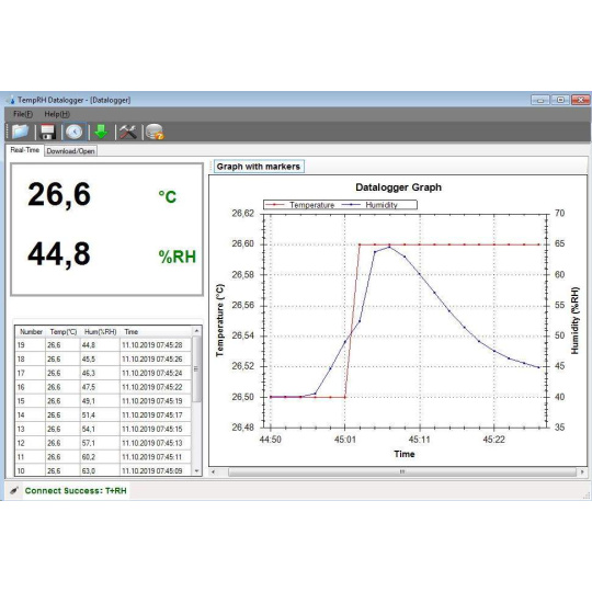 paměť pro 20 010 hodnot teploty a vlhkosti LCD displej o rozměrech 22 x 20 mm pro zobrazení aktuálních, minimálních a maximálních naměřených hodnot možnost nastavení načítání dat od 2 sekund do 24 hodin (2 až 30 s, dále 1, 5, 15, 30 min, dále 1, 5,12, 24 hodin) připojení k počítači přes USB port nastavitelný alarm horní a dolní meze pro teplotu a relativní vlhkost program TempRH Datalogger pro zobrazení naměřených hodnot pro OS Windows až do verze Windows 10 (32 bit a 64 bit) zobrazení naměřených dat v reálném čase v přiloženém programu včetně grafu možnost odloženého zahájení měření data ve formě zprávy v pdf fornátu a tabulky ve formátu *.csv a ve formátu *.imtr (Meter Files - lze otevřít přiloženým programem) součástí balení je datalogger, poutko, baterie, CD s programem a návod.