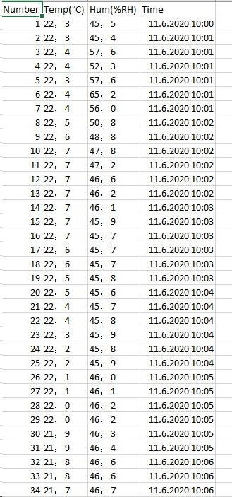 paměť pro 20 010 hodnot teploty a vlhkosti LCD displej o rozměrech 22 x 20 mm pro zobrazení aktuálních, minimálních a maximálních naměřených hodnot možnost nastavení načítání dat od 2 sekund do 24 hodin (2 až 30 s, dále 1, 5, 15, 30 min, dále 1, 5,12, 24 hodin) připojení k počítači přes USB port nastavitelný alarm horní a dolní meze pro teplotu a relativní vlhkost program TempRH Datalogger pro zobrazení naměřených hodnot pro OS Windows až do verze Windows 10 (32 bit a 64 bit) zobrazení naměřených dat v reálném čase v přiloženém programu včetně grafu možnost odloženého zahájení měření data ve formě zprávy v pdf fornátu a tabulky ve formátu *.csv a ve formátu *.imtr (Meter Files - lze otevřít přiloženým programem) součástí balení je datalogger, poutko, baterie, CD s programem a návod.
