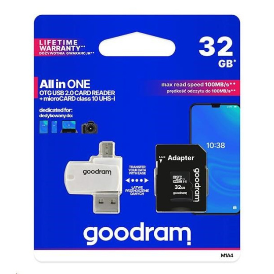 GOODRAM microSDHC karta 32GB M1A4 All-in-one (R:100/W:10 MB/s), UHS-I Class 10, U1 + Adapter + OTG card reader/čtečka