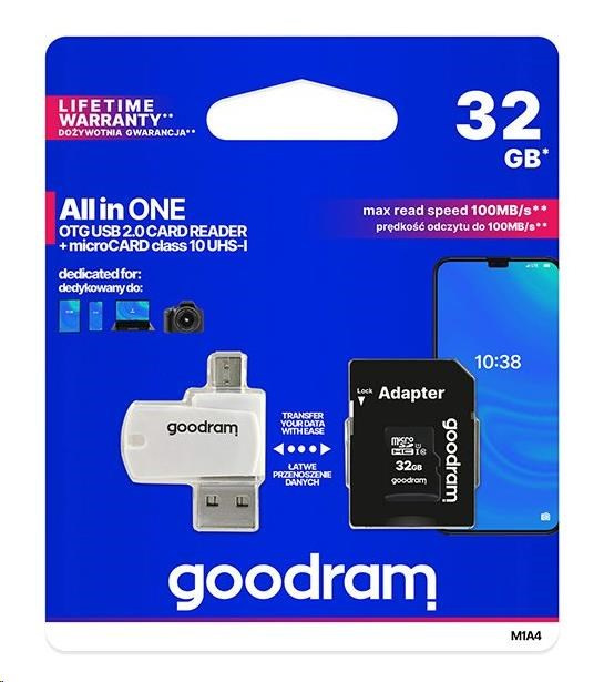GOODRAM microSDHC karta 32GB M1A4 All-in-one (R:100/W:10 MB/s), UHS-I Class 10, U1 + Adapter + OTG card reader/čtečka