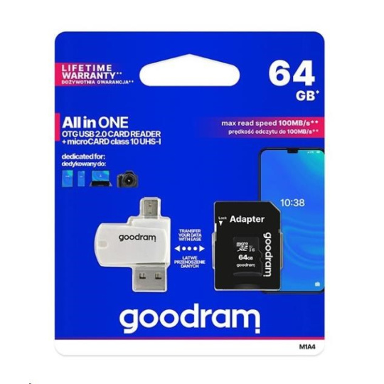 GOODRAM microSDXC karta 64GB M1A4 All-in-one (R:100/W:10 MB/s), UHS-I Class 10, U1 + Adapter + OTG card reader/čtečka
