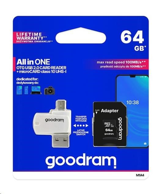GOODRAM microSDXC karta 64GB M1A4 All-in-one (R:100/W:10 MB/s), UHS-I Class 10, U1 + Adapter + OTG card reader/čtečka