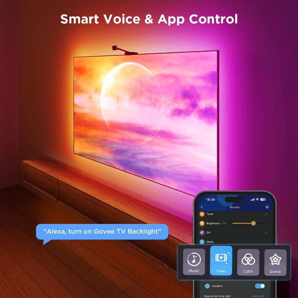 Vylepšete své filmové a seriálové zážitky s živým chytrým osvětlením Govee Smart TV Backlight 3S, které vám Govee přináší spolu se společností Netflix. 16 milionů barev s více než 99 režimy efektů, a další režimy pro synchronizaci s hudbou, povznese zážitek ze sledování televize nebo hraní her na novou úroveň díky smart technologii Envisual, která snímá obrazovku a automaticky podle toho upravuje nastavení světel. Ovládá se hlasem přes Siri, Amazon Alexa nebo Google Assistant. Díky podpoře protokolu MATTER není problém integrace do existujících smart home systémů. Nebudete proto ani muset stávat z gauče. Barevné podsvícení opticky zvětšuje obraz a také šetří vaše oči. Díky technologii RGBICW má pásek i bílé diody pro kontrastnější projekci. Navíc je pásek vybaven řídícími obvody a nabízí mnohem rychlejší reakci na změny obrazu, podstatně vyšší jas a lepší kontrast než obyčejné RGB pásky.