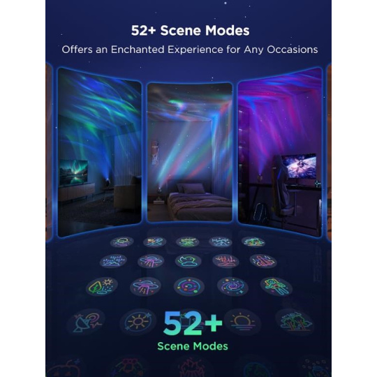 Govee Star Light Projector nabízí více než 52 přednastavených scén a výkonný DIY režim, který vám umožní nezávisle ovládat laserovou hvězdnou projekci i LED mlhovinu. Můžete kombinovat barvy, efekty a intenzitu světla podle svých představ, čímž vytvoříte unikátní a personalizované světelné show. Ať už toužíte po klidné relaxační atmosféře nebo dynamickém vizuálním zážitku, DIY režim vám poskytne plnou kreativní kontrolu.