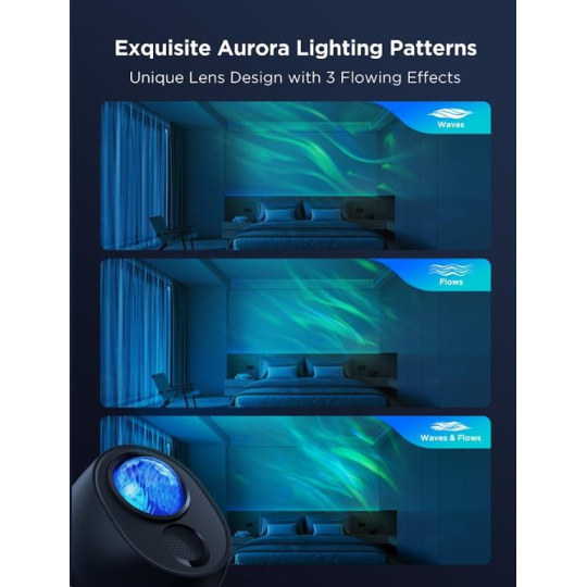Govee Star Light Projector přináší působivé mlhovinové vzory, které mohou být ve formě vln, plynulých proudů nebo jejich kombinace, čímž vytvářejí dynamickou a fascinující světelnou show. Vlnové vzory přidávají jemný pohyb a pocit klidu, zatímco proudové efekty dodávají energičtější a plynulejší dojem. Kombinace obou stylů pak vytváří neobyčejně komplexní a atraktivní projekci, která přinese do vašeho prostoru harmonii i živost. Tyto variace mlhoviny vám umožní přizpůsobit osvětlení přesně podle atmosféry, kterou chcete vytvořit.