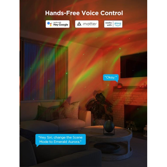 Projektor nabízí snadné ovládání prostřednictvím aplikace Govee Home, kde si můžete vybírat z několika přednastavených režimů nebo vytvářet vlastní světelné kombinace. Navíc je kompatibilní s hlasovými asistenty, jako je Amazon Alexa a Google Assistant, což vám umožňuje ovládat projekci i pomocí hlasových příkazů. Díky této chytré technologii můžete pohodlně přepínat mezi různými světelnými scénami nebo měnit barvy, aniž byste museli vstávat z pohovky. Díky protokolu Matter se může integrovat i do Homekitu.