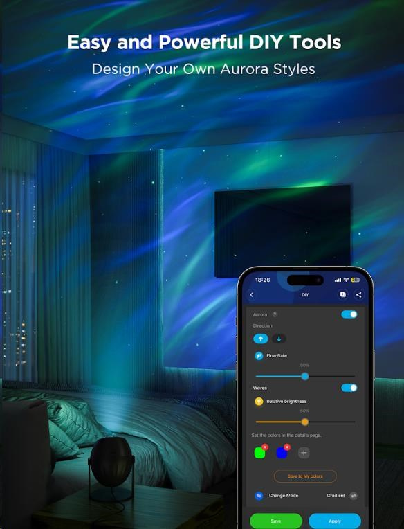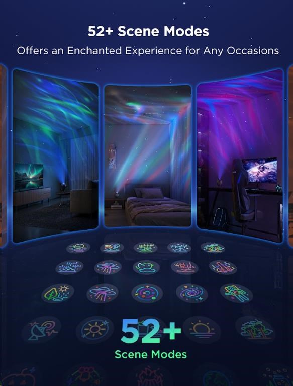Govee Star Light Projector nabízí více než 52 přednastavených scén a výkonný DIY režim, který vám umožní nezávisle ovládat laserovou hvězdnou projekci i LED mlhovinu. Můžete kombinovat barvy, efekty a intenzitu světla podle svých představ, čímž vytvoříte unikátní a personalizované světelné show. Ať už toužíte po klidné relaxační atmosféře nebo dynamickém vizuálním zážitku, DIY režim vám poskytne plnou kreativní kontrolu.