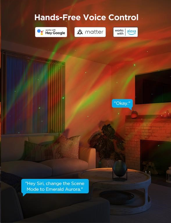 Projektor nabízí snadné ovládání prostřednictvím aplikace Govee Home, kde si můžete vybírat z několika přednastavených režimů nebo vytvářet vlastní světelné kombinace. Navíc je kompatibilní s hlasovými asistenty, jako je Amazon Alexa a Google Assistant, což vám umožňuje ovládat projekci i pomocí hlasových příkazů. Díky této chytré technologii můžete pohodlně přepínat mezi různými světelnými scénami nebo měnit barvy, aniž byste museli vstávat z pohovky. Díky protokolu Matter se může integrovat i do Homekitu.