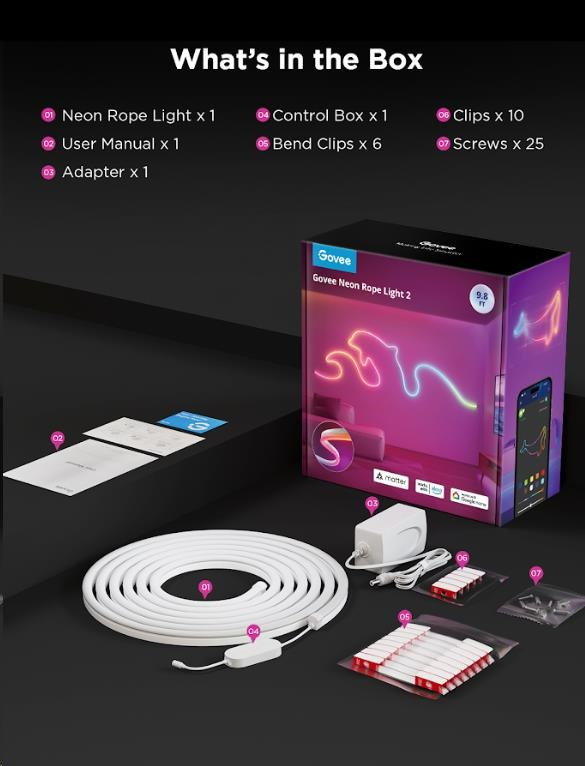 Instalace je velice jednoduchá pomocí samolepících klipů s 3M páskami. Nová generace neonových pásku je ještě ohebnější a tvarování je tak snazší. Vylepšeny byly i klipy a nabízí teď pevnější fixaci vymyšleného tvaru. Pro možnost maximální jistoty jsou v balení i šroubky. Govee Neon 2 je vhodné pro všechny místnosti a fantazii se meze nekladou!
