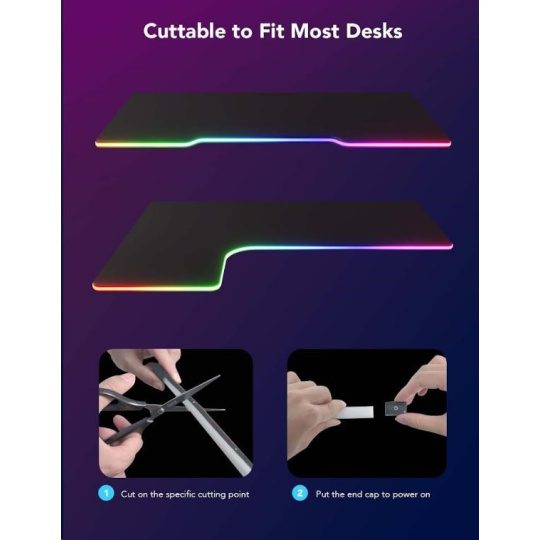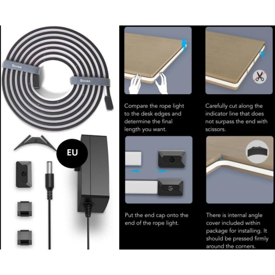 Instalace je velice jednoduchá pomocí 3M pásek. Govee Neon je pružný a ohebný pásek, který můžete tvarovat podle tvaru svého stolu. V balení jsou také svorky pro instalaci na stůl ve tvaru L nebo s pravými úhly. Celková délka je 3 metry a na pásku jsou značky, kde lze pásek zkrátit jednoduchým přestřihnutím pásku. Nestříhejte pásek mimo označené body k tomu určené, poškodíte tím kontakty a pásek.