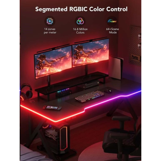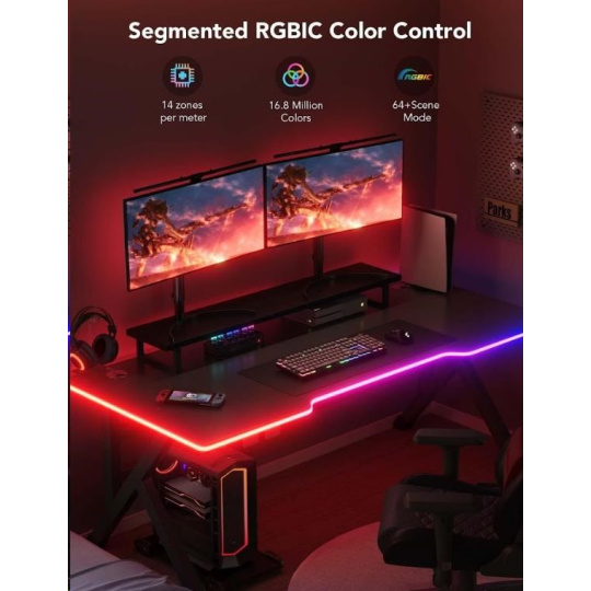 Světelný pásek Govee Neon Gaming Table Light nabízí více než 64 různých režimů pro dokonalé naladění světelné atmosféry. Govee technologie RGBIC umí zobrazit až 57 barev najednou z celkové škály 16 milionů barev při intenzitě 1-100%. Může se také pochlubit životností až 50.000 hodin.