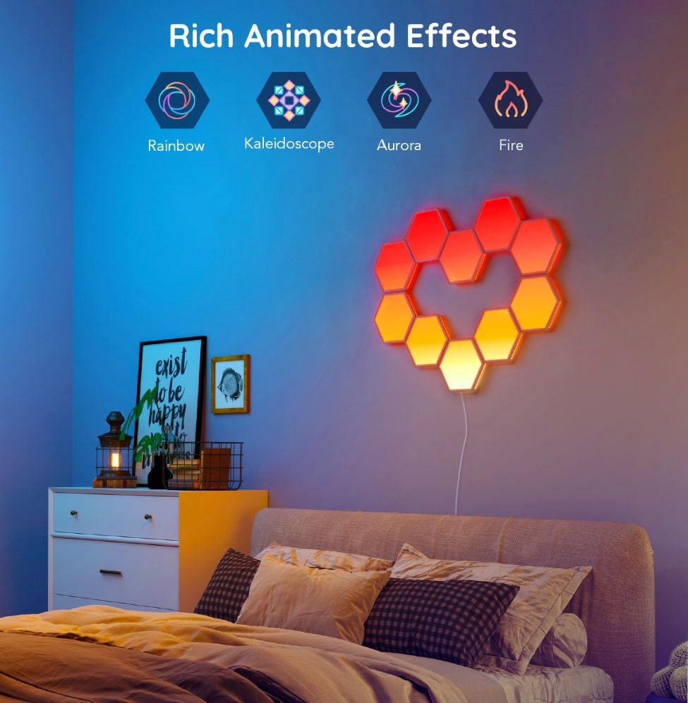 Vylepšete interiér a herní, filmové a hudební zážitky s designovým světlem Hexa Smart LED. Díky technologii RGBIC zobrazuje až 57 barev najednou. Barevnost si můžete nastavit po jednotlivých sekcích a kreativně si pohrát. Celkově umí zobrazit až 16 milionů barev s intenzitou 1-100%. Určitě si vyberete z mnoha režimů osvětlení a při poslouchaní oblíbené hudby si můžete zvolit také ze 6 rytmických režimů. Světla se ovládají hlasem přes Siri, Amazon Alexa nebo Google Assistant nebo přes aplikaci Govee Home na chytrém telefonu nebo tabletu. Světlo je určeno na instalaci na zeď a jeho tvar si můžete přizpůsobit podle vlastní fantazie. Jednoduchá instalace bez vrtání s životností až 50.000 hodin.