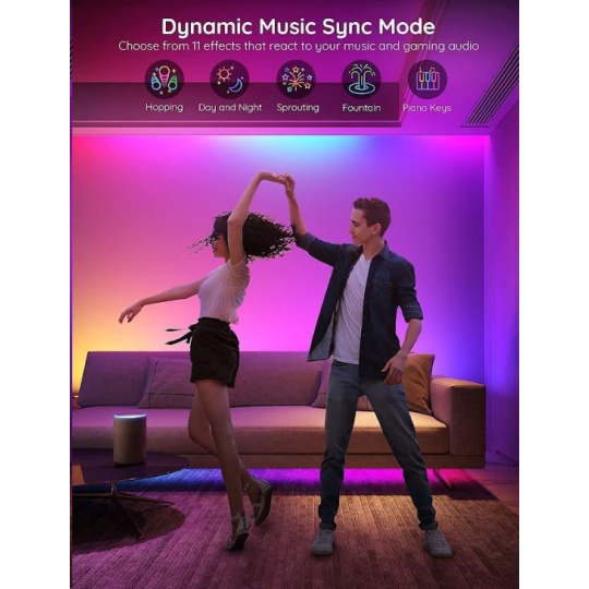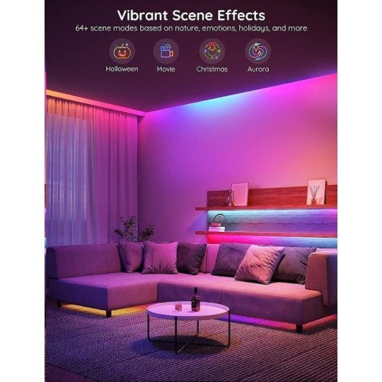 Úsporné interiérové chytré LED pásky Govee WiFi RGBIC PRO SMART 5m s životností až 50.000 hodin udělají z vašeho domu designový skvost. Můžete je použít prakticky všude - obývací pokoj, ložnice, kuchyň, pracovna atd. Zobrazuje až 16 milionů barev, jejichž intenzitu lze nastavit od 1-100 % a díky technologii RGBIC si můžete rozdělit pásek na samostatné segmenty, pro které si pak můžete volit rozdílné barvy. Vyberte si ze 64 režimů osvětlení a při poslouchaní oblíbené hudby se budou světla synchronizovat díky vestavěnému mikrofonu a vytvoří nezapomenutelný zážitek. Nebo si prostě nastavte svoje vlastní barevné kombinace v režimu DIY. Příkazy můžete zadat také hlasem přes Siri, Amazon Alexa nebo Google Assistant, přes aplikaci Govee Home na chytrém telefonu nebo tabletu nebo přes Control box. Světlo má délku 5 metrů a jeho instalace je velice jednoduchá. Pomocí časovače můžete světla zapínat a vypínat automaticky podle západu a východu slunce, nebo usínání a vstávaní.