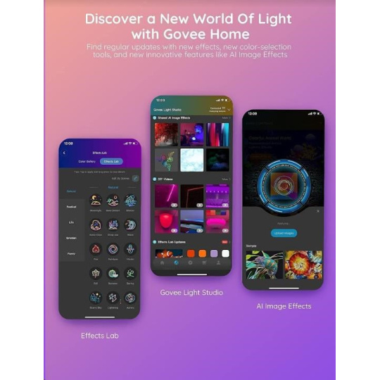 Spravujte nastavení barev a intenzity světla jednoduše pomocí aplikace Govee Home. Aplikace je zdarma ke stažení v Google Play a AppStore. Navíc získáte přístup k funkci časovače, DIY barvám, režimu videa, synchronizaci hudby a režimům scény. Rovněž si můžete pomocí časovače nastavit automatické vypnutí a zapnutí, třeba podle doby usínání a vstávaní. Ovládání hlasem je možné přes Siri, Amazon Alexa a Google Assistant.