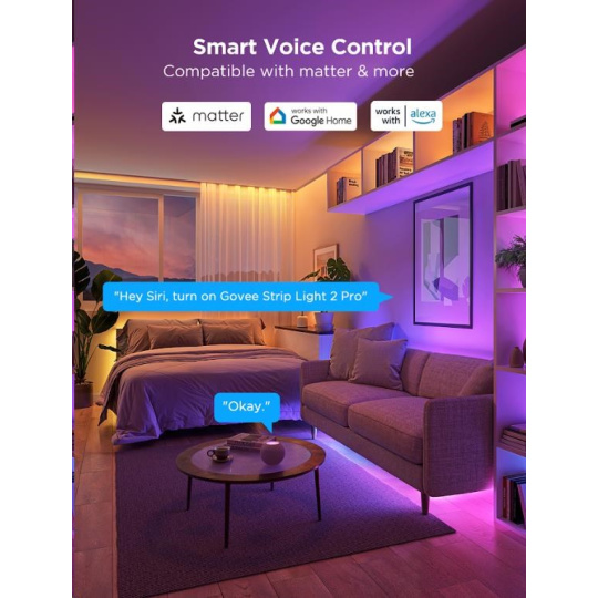 Govee LED Strip Light 2 Pro je vybaven in-house vyvinutým řídicím čipem G1151, který zajišťuje bezproblémovou a rychlou kontrolu světelných efektů. Diody RGBWWIC 5v1 poskytují perfektní reprodukci barev a dokonalé podání bílé barvy od teplé po studenou, hustota je 60 led na 1 metr. Pásek podporuje protokol Matter, což umožňuje bezproblémovou kompatibilitu s většinou smart home systémů s chytrými asistenty jako Google Assistant, Siri a Alexa, takže ji můžete snadno integrovat do své chytré domácnosti. Díky aplikaci Govee Home získáte plnou kontrolu nad barvami, jasem a segmenty LED pásky, přičemž je možné rozdělit pásku až na 6 segmentů na metr pro dokonalé barevné gradienty a personalizaci.