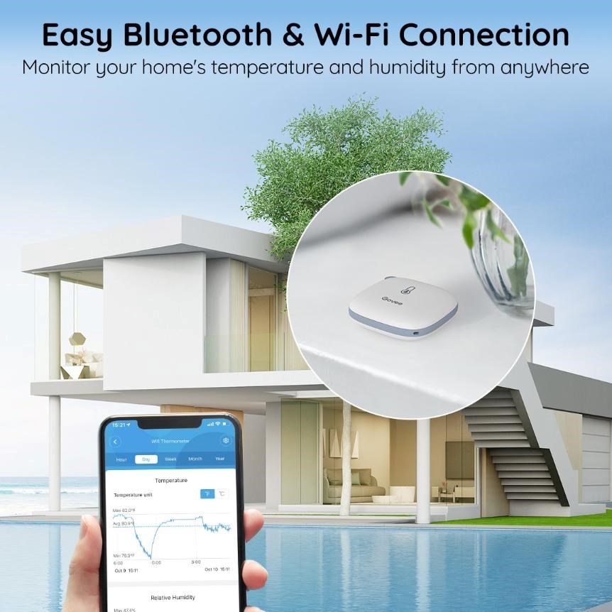 Díky kombinaci Wi-Fi a Bluetooth připojení máte naměřená data vždy pod kontrolou, ať jste doma nebo mimo něj. V aplikaci Govee Home sledujete teplotu a vlhkost v reálném čase přímo ve svém telefonu. Pohodlné dálkové monitorování vám umožní rychle reagovat na změny prostředí odkudkoli.