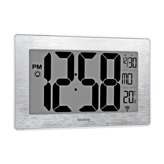 Digitální nástěnné hodiny s LCD displejem, nočním podsvícením, časem řízeným rádiovým signálem DCF-77 a měřením vnitřní teploty • nástěnné hodiny s možností postavení • velikost inverzního displeje 168 x 95 mm • možnost nastavení intervalu nočního podsvícení displeje oranžovým světlem, dva stupně jasu • velikost číslic - čas 87 mm, datum 15 mm (měsíc), 9 mm (den), teplota 19 mm • čas řízený rádiovým signálem DCF-77 • formát zobrazení času 12, nebo 24 hodin • datum s názvem dne (jazyk EN, DE, FR, IT a ES) • datum • časová zóna od -9 do +9 hodin • měření vnitřní teploty • ikona slabých baterií • napájení na baterie • barva bílá se stříbrným rámečkem.