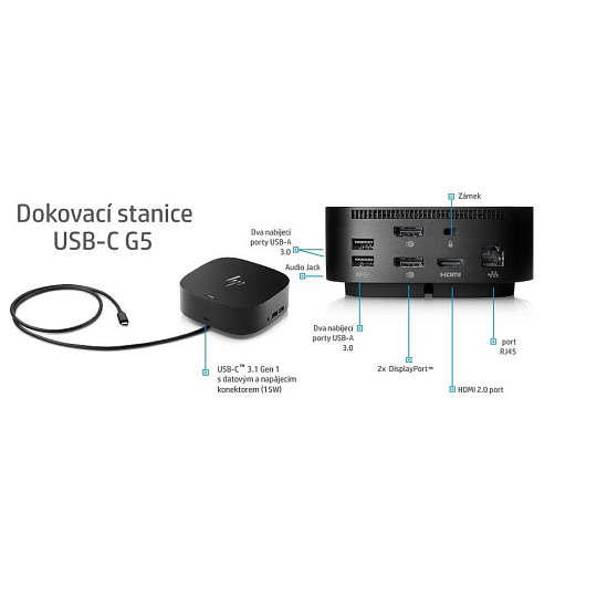 | Co je v krabici | Dokovací stanice HP USB-C Dock G5 Napájecí adaptér 120 W Dokumentace |