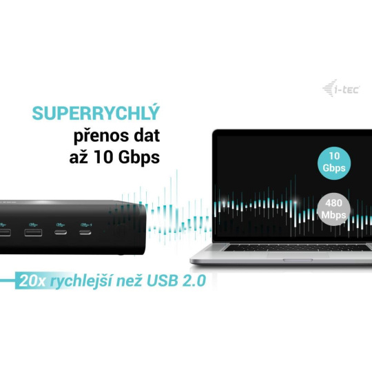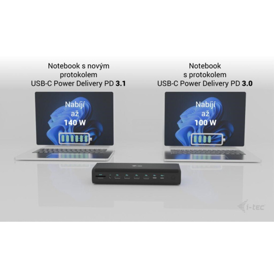 ** Pokud váš notebook nebo tablet podporuje nový a moderní nabíjecí protokol USB-A Power Delivery PD 3.1, dokovací stanice nabídne nabíjecí výkon až 140 W (pokud máte PD 3.0, nabíjecí výkon bude 100 W).