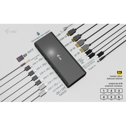 Dokovací stanice s nejvyšším možným výkonem! Podporuje až šest externích monitorů* s rozlišením 4K/60 Hz. Nebo dva mohou běžet současně i v rozlišení 8K! Ideální produkt pro uživatele, kteří vyžadují více monitorů, aniž by museli dělat kompromisy v oblasti stability obrazu, rozlišení a obnovovací frekvence. Dokovací stanice je také vybavena portem pro rychlé nabíjení USB-C (s nabíjecím výkonem až 30 W), zejména pro nabíjení smartphonů a tabletů, rychlými porty USB, portem LAN 2,5 Gbps, jakož i dalšími periferiemi.