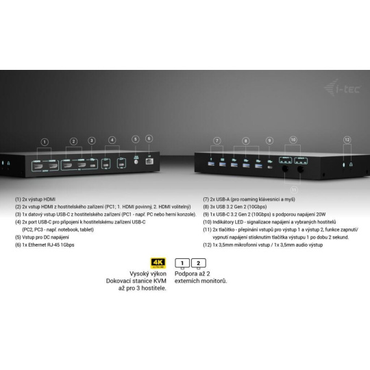 i-tec USB-C KVM Dock PRO for Three Hosts, Dual Video, with 2x Power Delivery, max 92W