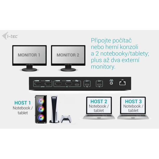 - Podpora až 3 hostitelských zařízení (2× notebook/tablet + 1× herní konzole/PC)