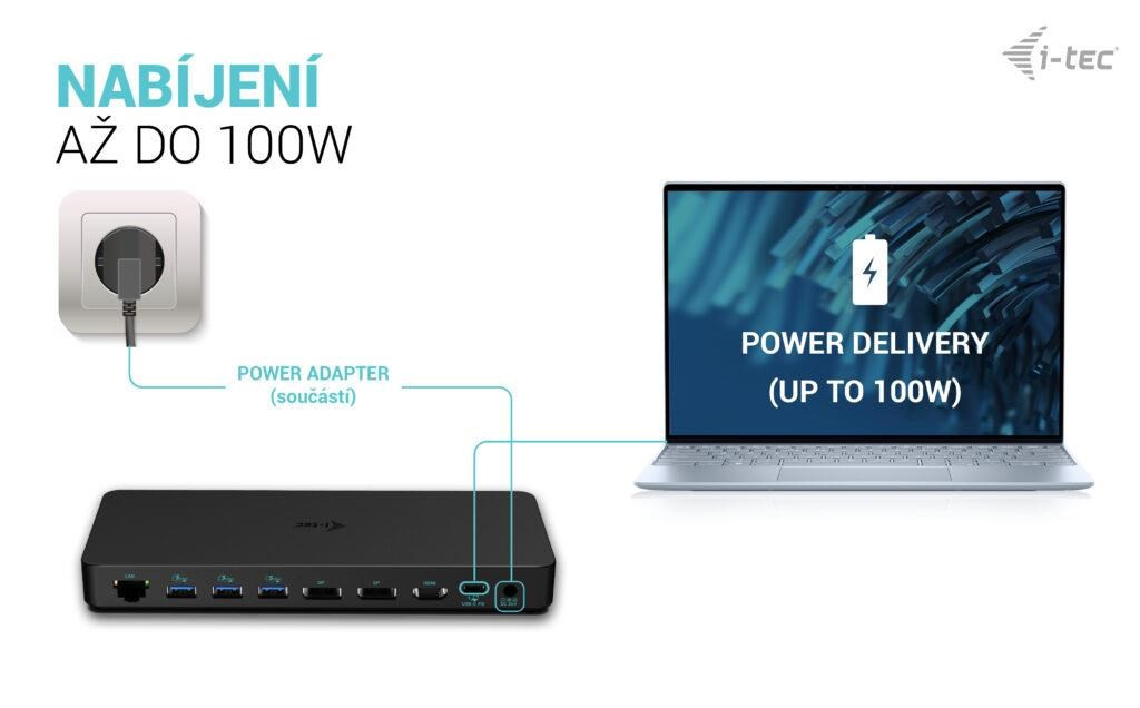 - Dokovací stanice podporuje až 100W napájení připojeného notebooku nebo tabletu.