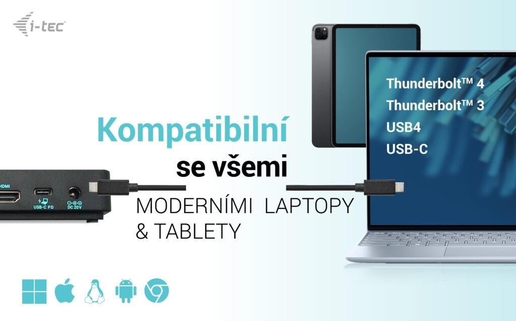 - Dokovací stanice je kompatibilní se všemi moderními notebooky vybavenými porty USB-C, USB4 nebo Thunderbolt™ 3/4.
