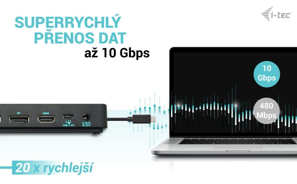 - Volitelné klonování adres MAC a automatické zálohování dat připojeného počítače (při použití softwaru i-tec Docker Pro).