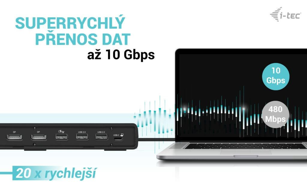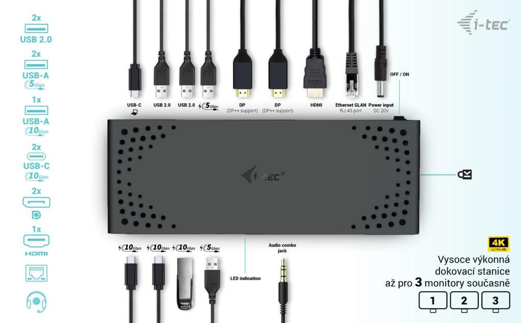 - Volitelné klonování adres MAC a automatické zálohování dat připojeného počítače (při použití softwaru i-tec Docker Pro).