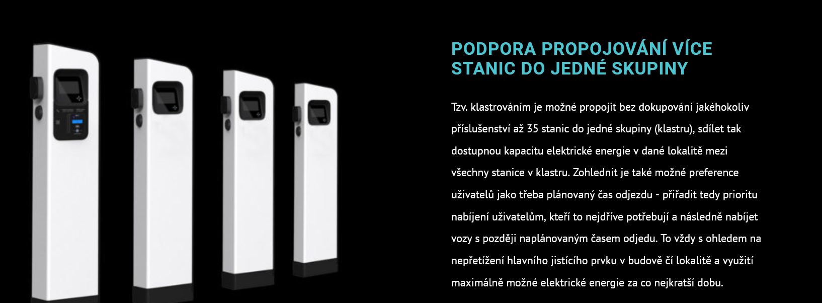 Možnost propojení několika nabíjecích stanic do skupiny a řízení spotřeba/maximálního výkonu celé skupiny Podpora max.35 stanic ve skupině, při počtu nad 35 stanic je možné doplnit průmyslovým PC (následně je možné vytvořit klastr o 300ks)