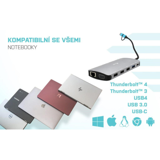- Dokovací stanice je kompatibilní s téměř jakýmkoli současným notebookem (připojení přes porty USB 3.0, USB-C, USB4 nebo Thunderbolt™ 3/4).