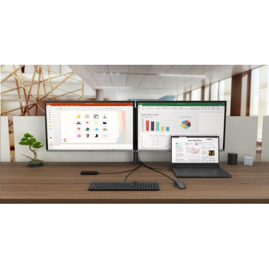 Kancelářská dokovací stanice USB-C, která podporuje až 2x externí monitor v rozlišení 4K. Stanice je kompatibilní s jakýmkoliv notebookem vybaveným portem USB-C nebo Thunderbolt 3. 6x USB port, spolehlivé a rychlé připojení do podnikové sítě díky integrovanému LAN portu, napájení až 100 W a podpora instalace za monitor, to vše z této dokovací stanice dělá ideálního společníka pro profesionály.