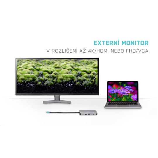 Malá kovová USB-C dokovací stanice, která dokáže snadno připojit externí monitor či projektor, a to prostřednictvím portu HDMI nebo VGA. Jednoduše připojte váš notebook či tablet (instalace ovladačů není nutná) a využijte rychlého datového USB, připojení k internetu prostřednictvím LAN portu, spolu s možností připojit vaše sluchátka a mikrofon. Samozřejmostí je podpora napájení vašeho notebooku, a to až do 100 W, což znamená, že budete schopni nabít všechny notebooky a tablety, které nabíjení prostřednictvím USB-C (USB-C Power Delivery) podporují.
