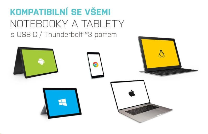 Dokovací stanice je plně kompatibilní i s notebooky a tablety, vybavenými portem Thunderbolt 3.