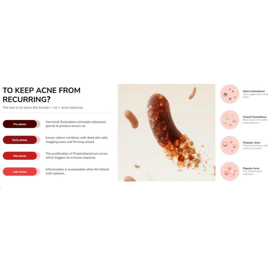 - Klinicky ověřená účinnost: Likviduje více než 99 % bakterií Propionibacterium acnes, redukuje kožní maz o 56 % za 3 dny a zmenšuje objem akné o 63 % za 7 dní.