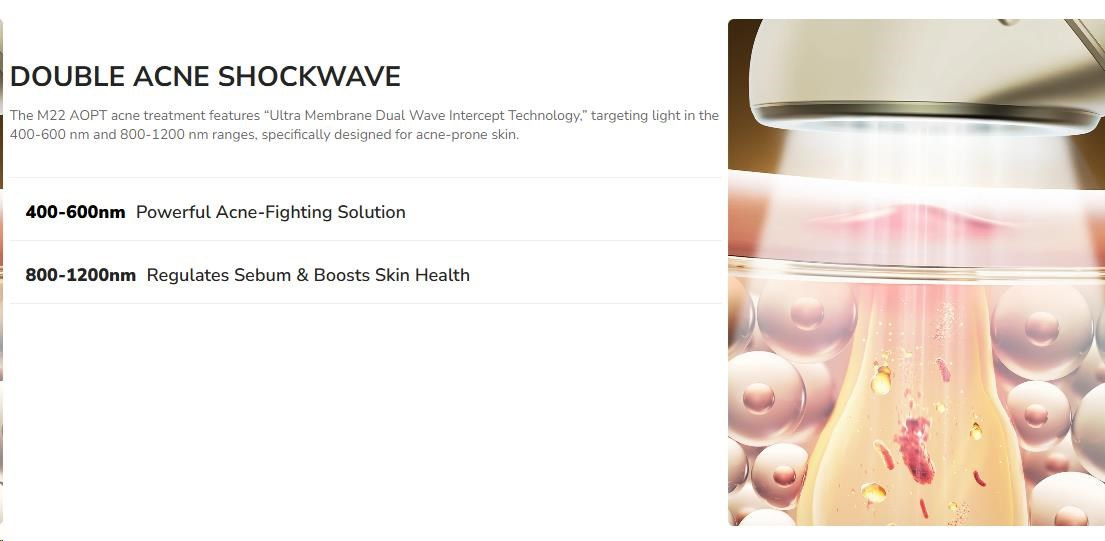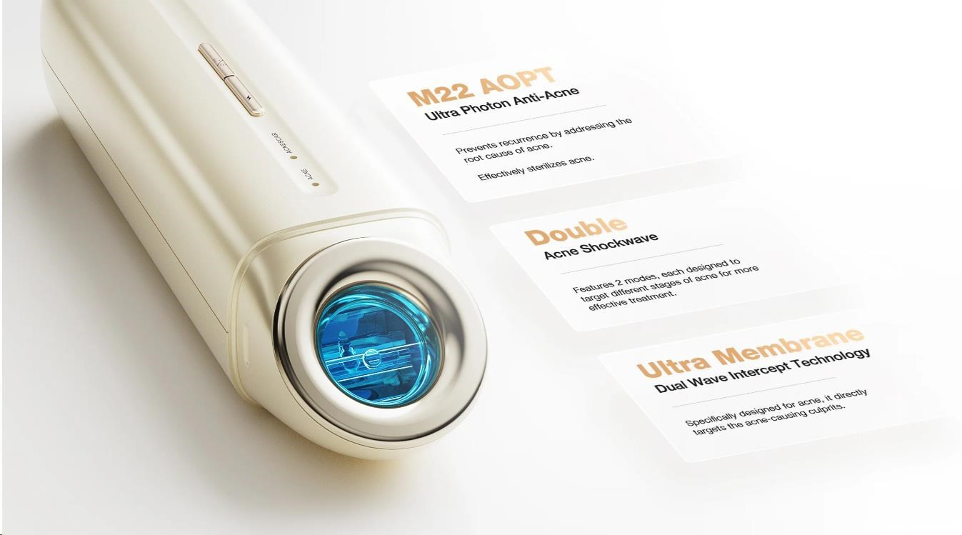 Tento inovativní přístroj využívá unikátní "světelně-biologickou" technologii pro maximální efekt. Dvojitá rázová vlna intenzivního pulzního světla proniká hluboko do pokožky, kde ničí bakterie Propionibacterium acnes a reguluje produkci mazu.