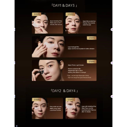 - Den 2 a 4 (Intenzivní výživa): Aplikujete lyofilizované náplasti s hydrolyzovaným kolagenem a peptidy a překryjete je hydratační maskou na 15 minut.