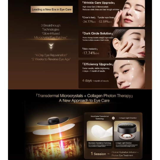 Oční okolí je nejjemnější a nejzranitelnější částí naší tváře, která stárne až 8krát rychleji než zbytek obličeje. Dopřejte mu péči, kterou si zaslouží, a objevte revoluční řešení, které přináší výsledky srovnatelné s profesionálními klinikami. Představujeme vám JOVS RevivaEye, první mikrokrystalické oční náplasti s technologií "Blackthorn" a světelnou terapií na trhu. Značka JOVS opět kombinuje špičkovou vědu a luxusní péči, aby vám poskytla komplexní omlazení očního okolí z pohodlí domova.
