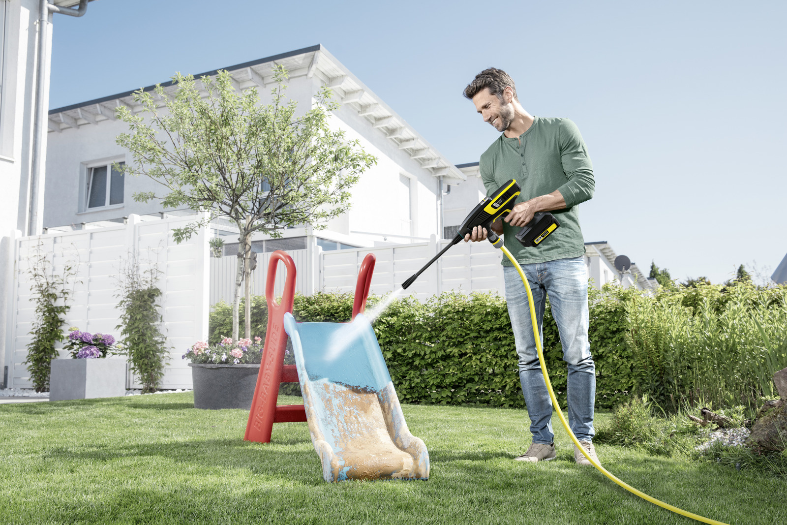 Lehká přenosná tlaková myčka KHB 6 AKU platformy Kärcher 18 V vyčistí prakticky všechno okolo domu nezávisle na elektrickém proudu. Stačí jednoduše připojit hadici a jde se na věc. Pomocí trysky s plochým paprskem se zahradní nábytek, hračky a mnohé další rychle zbaví nepříjemných nečistot.