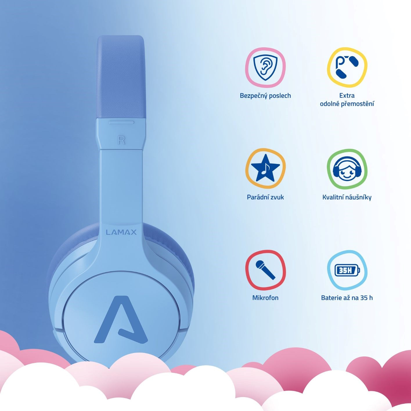 Každý rodič občas šílí z toho, když dítě sleduje dokola stejnou pohádku nebo poslouchá dětský hit, sluchátka LAMAX BaseKid1 jdou tak perfektním řešením a zároveň bezpečným. Maximální hlasitost je totiž omezena, a to na 85 nebo 94 dB, stačí přepnout na zvolenou. Zároveň disponují sluchátka technologií LAMAX SafeSound2.0© navrženou pro ochranu sluchu. I při těchto opatřeních si ale dítě užije poslech v parádní kvalitě díky LAMAX BeatBass©.
