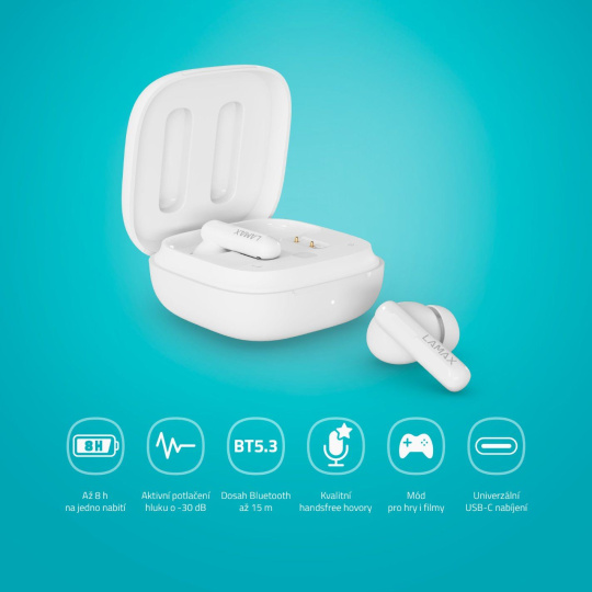 Perfektní zvuk v cool baleníNejlepší zvuk, jaký si umíš představit, v naprosto top designu a s dlouhou výdrží až 8 hodin, tak tohle všechno můžeš mít s LAMAX Clips1 Plus. Bezdrátová špuntová sluchátka s nožičkou do uší se automaticky bleskově spojí přes Bluetooth 5.3 s tvým telefonem a dopřejou ti dokonalý požitek, ať už posloucháš cokoliv. Gamerům určitě neunikne Herní mód, který zvýší požitek ze hry. Dotykem si přeskakuješ mezi tracky nebo přijímáš hovory, u kterých oceníš kvalitní mikrofon. To nejlepší je ale dokonale čistej a vyrovnanej zvuk, AAC, SBC kodeky, ANC pro potlačení okolního hluku a Transparency mode, aby byl poslech perfektní i bezpečnej. Tak cestuj, pracuj nebo sportuj stylově a v rytmu.