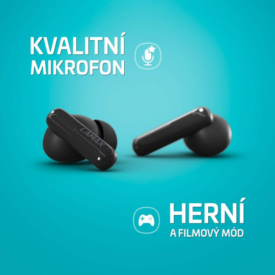 Perfektní zvuk v cool baleníNejlepší zvuk, jaký si umíš představit, v naprosto top designu a s dlouhou výdrží až 8 hodin, tak tohle všechno můžeš mít s LAMAX Clips1 Plus. Bezdrátová špuntová sluchátka s nožičkou do uší se automaticky bleskově spojí přes Bluetooth 5.3 s tvým telefonem a dopřejou ti dokonalý požitek, ať už posloucháš cokoliv. Gamerům určitě neunikne Herní mód, který zvýší požitek ze hry. Dotykem si přeskakuješ mezi tracky nebo přijímáš hovory, u kterých oceníš kvalitní mikrofon. To nejlepší je ale dokonale čistej a vyrovnanej zvuk, AAC, SBC kodeky, ANC pro potlačení okolního hluku a Transparency mode, aby byl poslech perfektní i bezpečnej. Tak cestuj, pracuj nebo sportuj stylově a v rytmu.