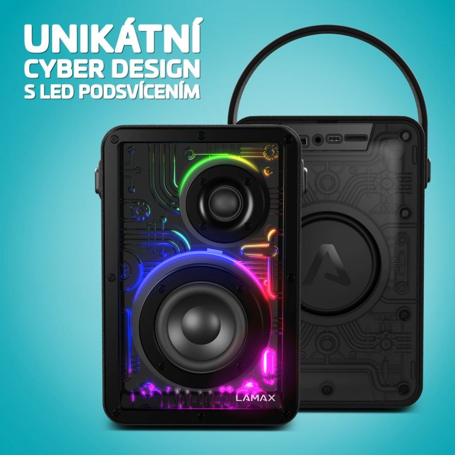 Rozjeď party, na kterou jen tak nikdo nezapomene nebo si užívej poslech muziky i podcastů, jako kdyby byl interpret s tebou v místnosti. Jde to snadno, na scénu totiž přichází LAMAX CyberWave1, party reproduktor se 4 nastavitelnými Cyber LED efekty, který všechny naprosto uchvátí. Jeho tělo s dvoupásmovými reproduktory duní výkonem až 50 W a BeatBass® technologie tě úplně pohltí, tak parádní zvuk poskytuje. Reprák podporuje širokou škálu formátů i připojení, parádně až na 15 metrů funguje jeho moderní Bluetooth 5.3, který ho automaticky spáruje s různými zařízeními. Party se často protáhnou, ale to nevadí, protože baterie repráku vydrží až 20 hodin, pak ho jen stačí dobít přes USB-C a jede se dál. Tenhle reprák je velký fešák vyvedený v mobilním Cyber designu s madlem pro snadné přenášení. Jednoduchý a intuitivní je i jeho ovládání. Užívej si večírky klidně i venku nebo u bazénu, nějaká voda repráku neublíží. Je voděodolný s ochranou IPX5.