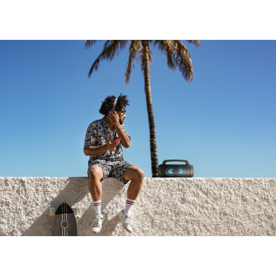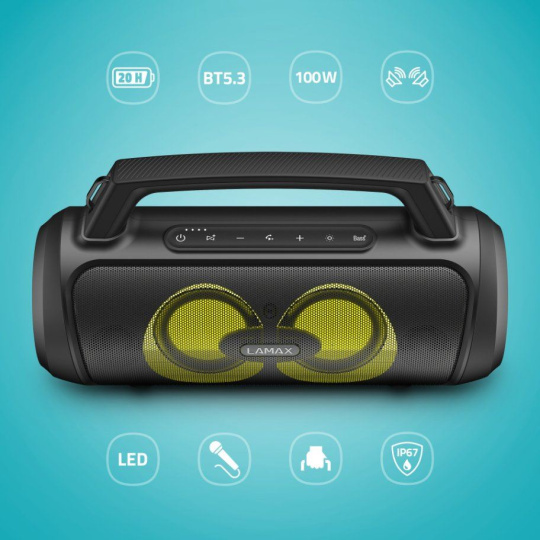 Malé tělo s velkým výkonemRozjeď kdekoliv i neplánovanou party ve velkém stylu. Přenosný party reproduktor LAMAX PartyGo1 je vzhledem malý, ale ukrývá v sobě velkou sílu, výkon 100 W. Technologie BeatBass® mu dává silný, plný a bohatý zvuk. Grilovačku, narozeninovou oslavu nebo menší party oživí 3 režimy LED podsvícení a možnost připojení mikrofonu, když si chceš užít karaoke nebo akci moderovat. Reprák se automaticky spáruje s jakýmkoliv zařízením prostřednictvím Bluetooth 5.3, který poskytuje bezchybný přenos až na 18 m. Na pohodu s tebou bude nový parťák i cestovat, baterie mu vydrží až 20 hodin a má navíc šikovné madlo nebo popruh přes rameno. Připojíš ho jak přes BT, tak USB, microSD, případně AUX a umí se proměnit taky v powerbanku přes USB-A vstup. A když jeden reprák nestačí, můžeš ho spárovat s druhým.