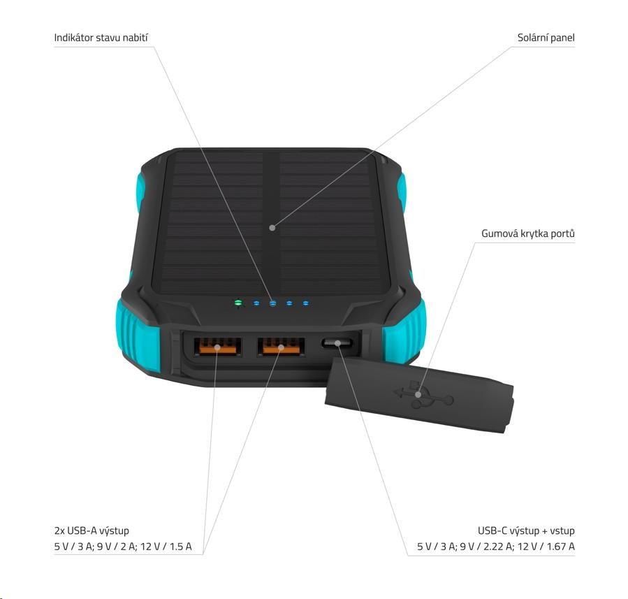Díky USB-A + USB-C výstupu můžeš nabíjet další zařízení skoro jakýmkoliv kabelem, co máš po ruce. Kabel USB-A -> USB-C navíc dostaneš v balení.