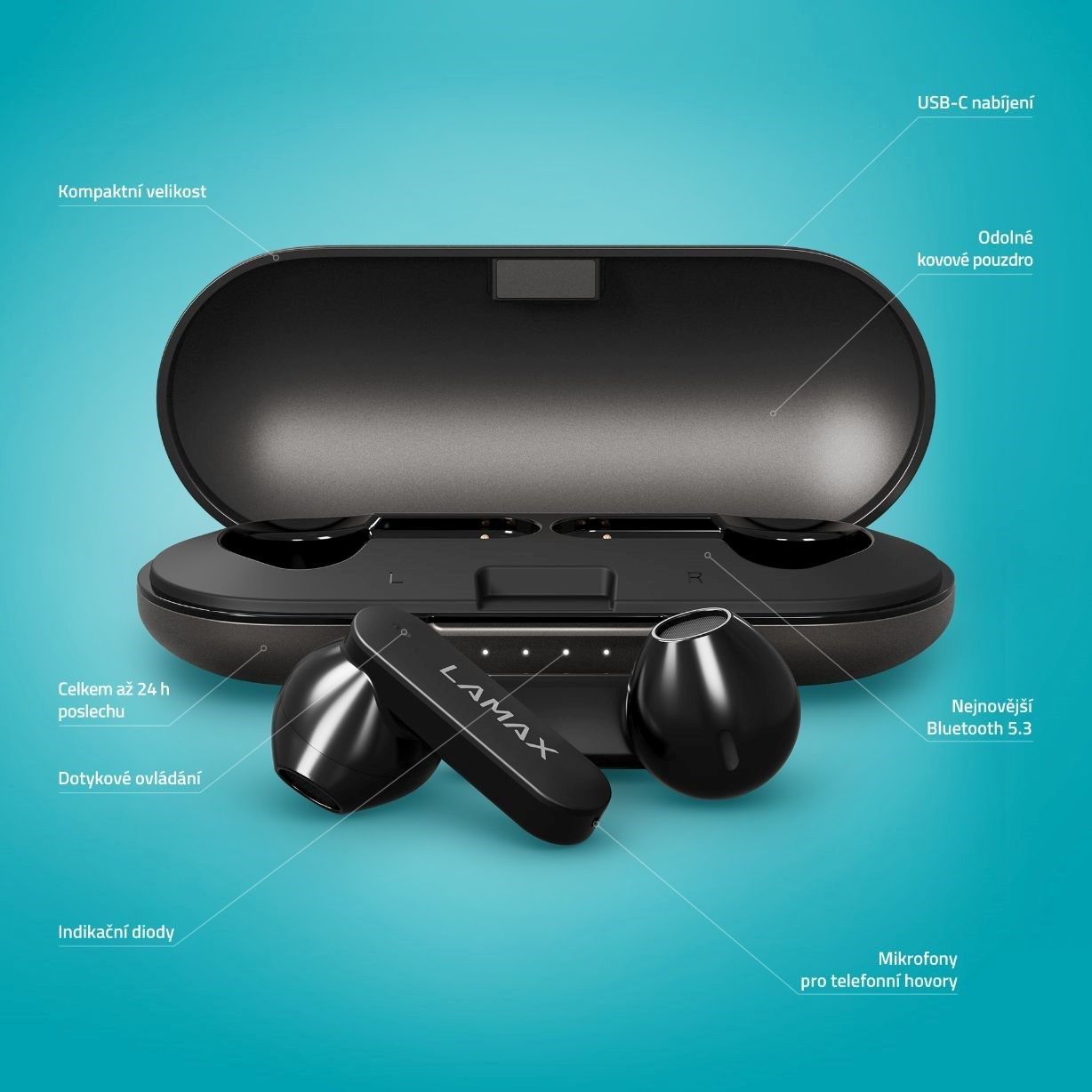 Dopřej svým uším parádně čistý a vyrovnaný zvuk, ať už telefonuješ, posloucháš svoje oblíbený songy nebo třeba podcast. Bezdrátový peckový TWS sluchátka s nožičkou LAMAX SteelTones1 s nejnovějším Bluetooth 5.3 mají nejen super zvuk, ale taky kvalitní mikrofon a dokonalou ergonomii, takže doma, při sportu, na cestách nebo třeba v práci se na ně můžeš vždycky spolehnout. Sluchátka ovládáš jednoduše dotykově včetně vyvolání hlasového asistenta. Baterie jim vydrží až 6 hodin a další šťávu máš schovanou v dobíjecím pouzdře, takže až 24 hodin jsi cajk. Skladný pouzdro je kovový, tudíž fakt odolný, svoje sluchátka máš tak dobře chráněný, zároveň má velikost akorát do kapsy. Taky mají voděodolnost IPX5, což se hodí, když při běhu zmokneš. Tyhle designově vychytaný sluchátka jsou kompatibilní s AAC & SBC kodeky, automaticky se spárujou s tvým zařízením a pro dobití jim slouží univerzální USB-C konektor. Dej svýmu poslechu novej rozměr.