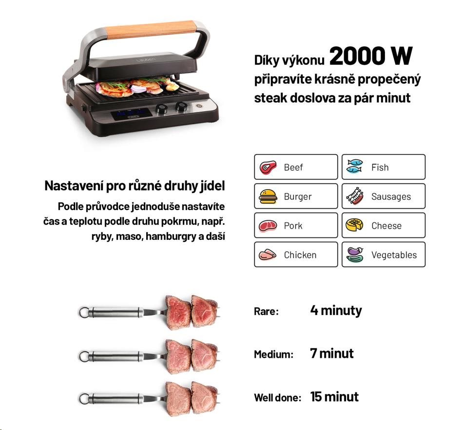 Gril se díky výkonu 2000 W rozehřeje velmi rychle a poradí si i se steaky, které vyžadují prudké opečení při vysoké teplotě.
