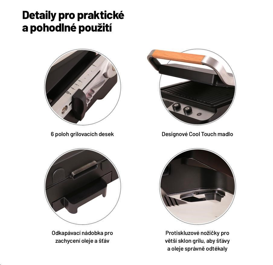 K manipulaci s grilem slouží designové madlo v dřevěném vzhledu s funkcí Cool Touch.